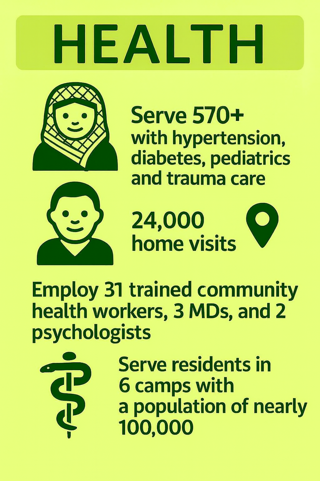 #1. Make a Health Clinic Ready for Large-scale Use. It will serve 2 camps with a total population of over 10,000 -- expanding screenings, chronic disease management & follow-up care.